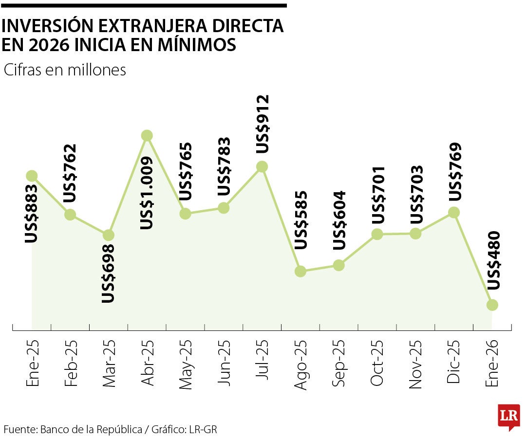 En línea con la caída de 2,9% que tuvo la inversión en 2025, según el dato del PIB, la inversión extranjera directa (IED) reportada por el Banco de la República inició 2026 a la baja. De acuerdo con el consolidado de la Balanza Cambiaria, enero de este año inició con un monto de US$460 millones. Este es el dato más bajo registrado según la serie, desde febrero de 2024.