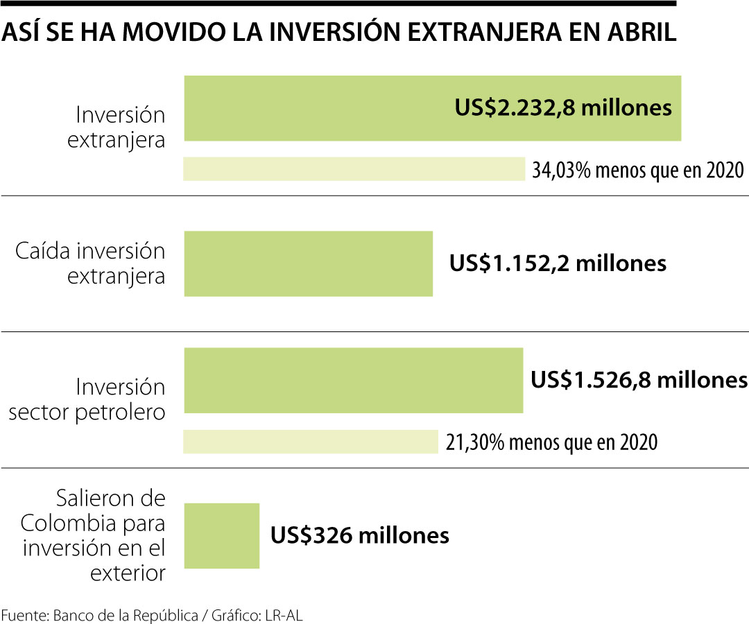 Según cifras del Banco de la República, para abril la inversión extranjera en Colombia, disminuyó 34,01% a US$2.232,8 millones, comparado con el mismo periodo del año pasado, fecha para la cual registró inversión por $3.385 millones.