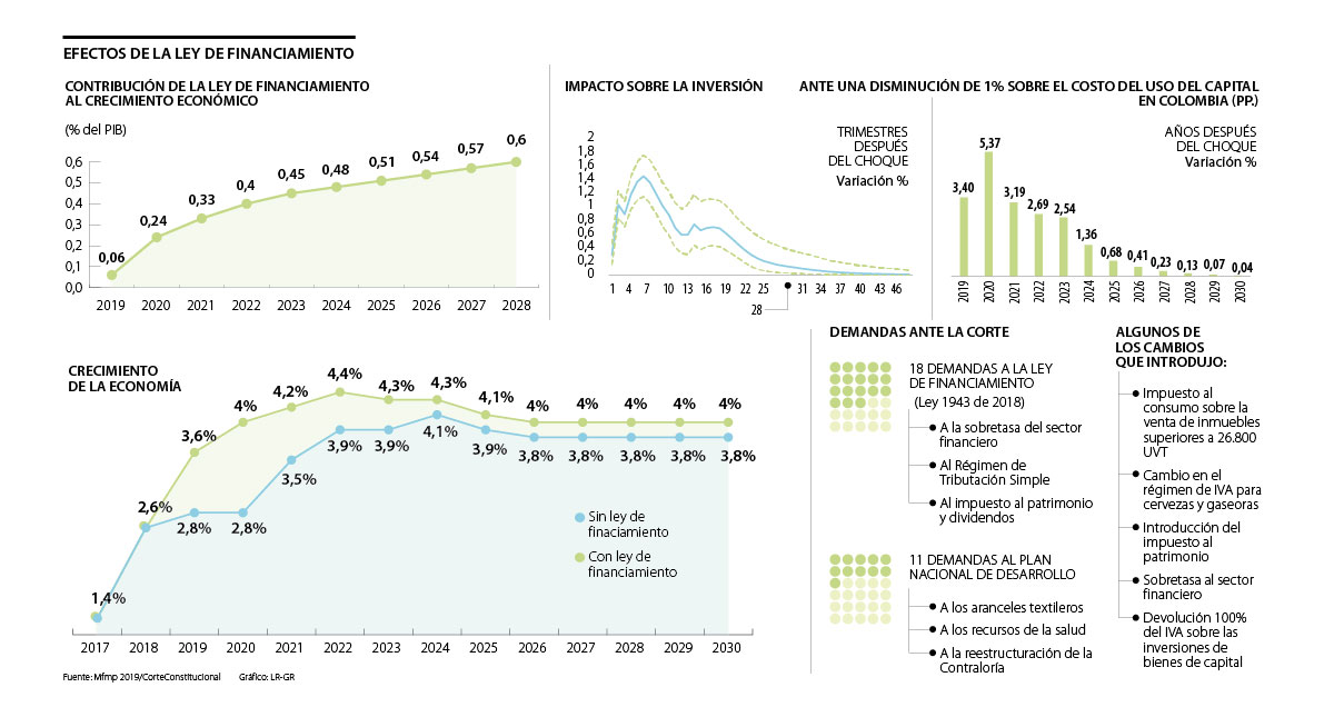 Y es que la cartera económica proyecta que esa ley, la 1943 de 2018, será uno de los ejes principales para que la economía crezca a un ritmo de 4,0% en el mediano plazo. No solo se prevé que su efecto incrementará el recaudo tributario al pasar de 0,1% del PIB en 2019, a 0,4% del PIB en 2022 y 0,7% en 2030, sino que también se estima que ayudará a elevar en cerca de 3,4% la inversión en 2019 para llegar a crecer 5,4% en 2020.