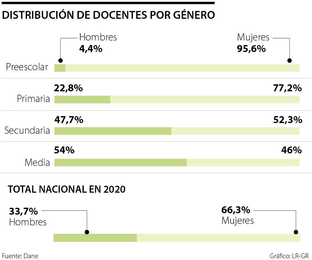 Durante el año pasado, del total nacional de los docentes de la educación formal 66,3 % eran mujeres, ya que su participación como educadoras es superior a la de los hombres en los niveles de preescolar con 95,6%, en el nivel de primaria con 77,2% y en básica secundaria con 52,3%. Mientras que en el nivel educativo de la media, 54,0 % de los educadores eran hombres.