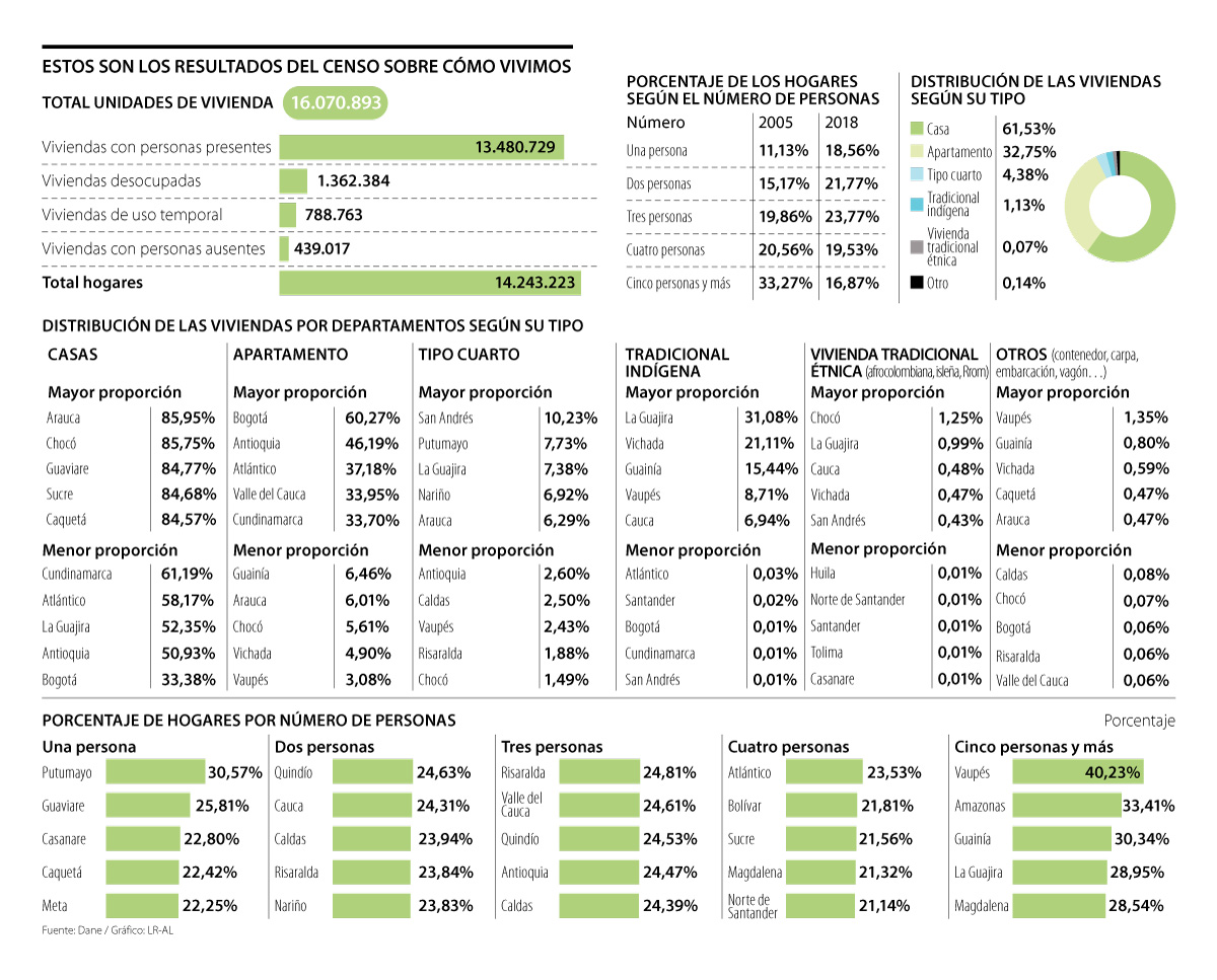 En total, según los resultados que arrojó el Censo de Población y Vivienda 2018, se estima que hay 13,4 millones de viviendas habitadas y que otras 1,3 millones están desocupadas. Estas, se concentran cada vez más en las cabeceras municipales (77%) y el tamaño promedio del hogar se redujo de 3,9 a 3,1 personas.