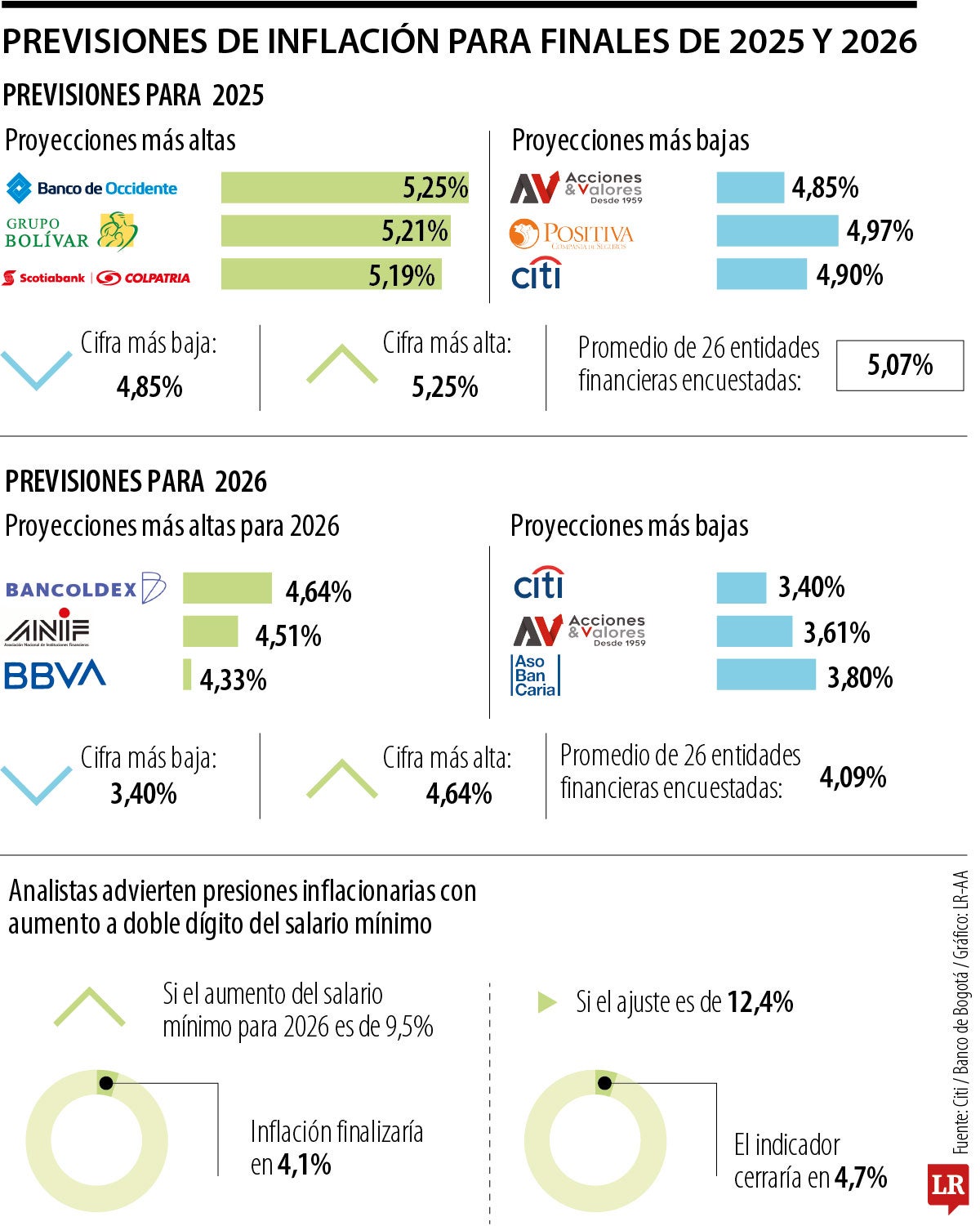 El equipo económico del Banco de Bogotá reveló que, si el alza del salario mínimo para 2026 es de 9,5%, la inflación finalizaría en 4,1%, pero si el ajuste es de 12,4%, el indicador macroeconómico cerraría en 4,7%. Añadieron que la implementación o entrada en vigencia de una reforma tributaria para financiar el Presupuesto de ese año también generaría presiones inflacionarias.