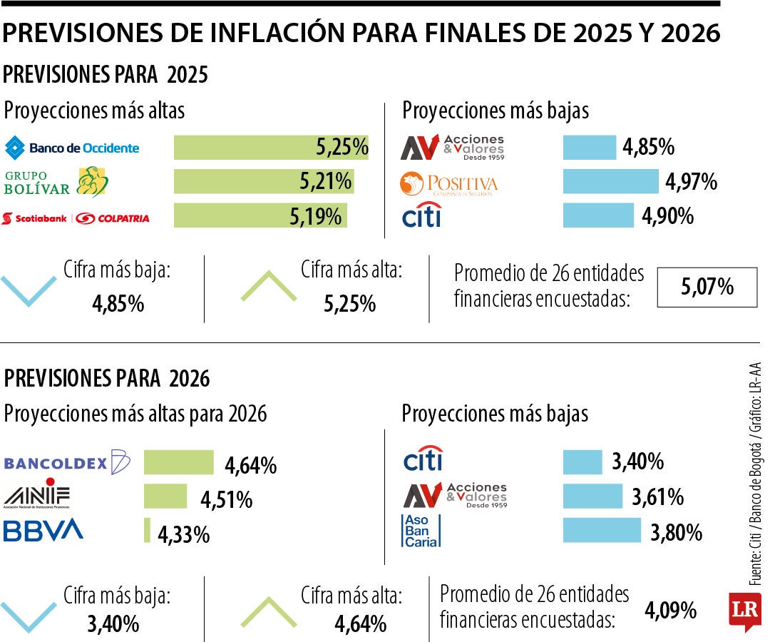 El mercado financiero proyectó que para finales de 2025 habría una inflación de alrededor de 5,07%. Entre las proyecciones más altas se encuentran la del Banco de Occidente, que señala que esta se ubicaría en 5,25%; también está el Grupo Bolívar (5,21%) y Scotiabank (5,19%).