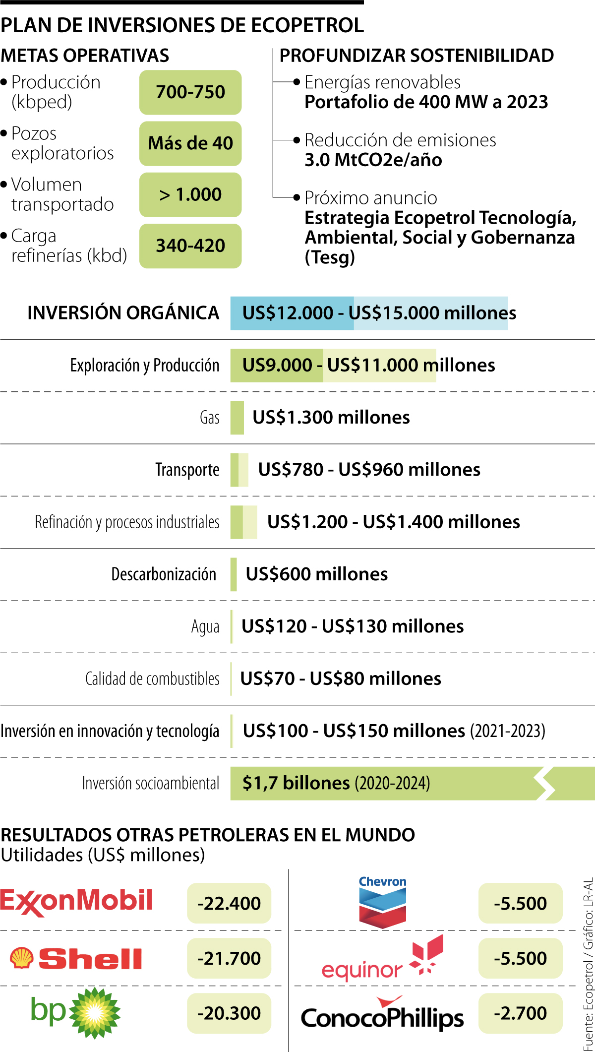 En cambio, se destinarán entre US$1.200 y US$1.400 millones en refinación y procesos industriales para asegurar la competitividad de los activos y la calidad de los combustibles. Otros US$600 millones irán a la descarbonización; entre US$100 y US$150 millones a la innovación; y $1,7 billones a inversión socioambiental. Esto, para cumplir con la meta de 400 mw en no convencionales.