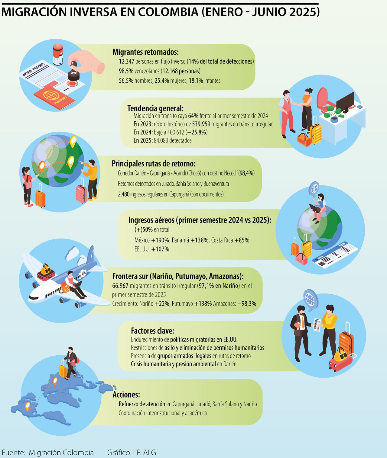Durante el primer semestre de 2025 también se identificaron más de 12.300 migrantes en flujo inverso, equivalentes a 14% del total de detecciones en Colombia.