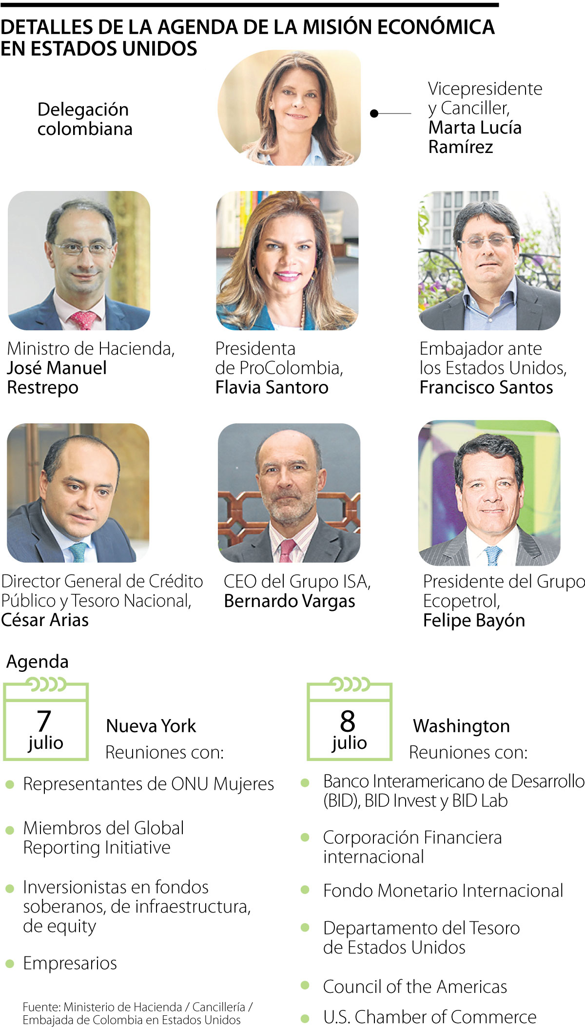 La delegación colombiana la dirige la vicepresidenta y canciller Marta Lucía Ramírez. Además, está conformada por el ministro Restrepo; el embajador ante los Estados Unidos, Francisco Santos; el director general de Crédito Público, César Arias, y la presidenta de ProColombia, Flavia Santoro.