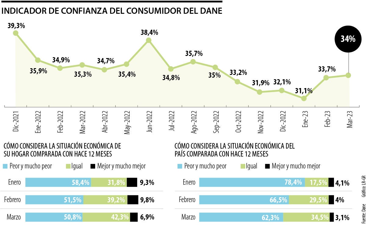 En el tercer mes de este año, el Indicador de Confianza del Consumidor del Dane se ubicó en 34 puntos, que si bien muestra una recuperación frente al dato inmediatamente anterior (33,7), empeoró frente a marzo del año pasado, cuando fue de 35,3. Los hombres registran un menor nivel de confianza, llegando a 34,8 en marzo. Por ciudades, en el primer trimestre del año Pereira (27,2), Quibdó (28,7), Tunja (29), Villavicencio (29,3) y Neiva (29,9) fueron las que registraron menores indicadores de confianza. Por el contrario, Montería (38), Bucaramanga (37,9) y Cúcuta (37,8) son las que tienen los mayores niveles.