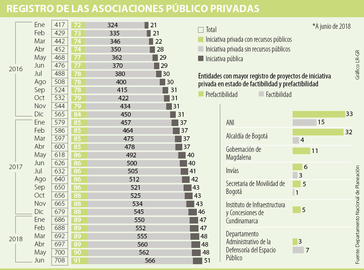 La entidad que tiene más registros es la Agencia Nacional de Infraestructura (ANI), que cuenta con 33 proyectos en etapa de prefactibilidad y 16 en factibilidad. De estos, 44 proyectos son de iniciativa privada sin recursos públicos, cuatro de iniciativa privada con recursos públicos y uno de iniciativa pública. De estos proyectos, 25 son de vías, 12 de transporte masivo, 11 de aeropuertos y uno de renovación urbana.