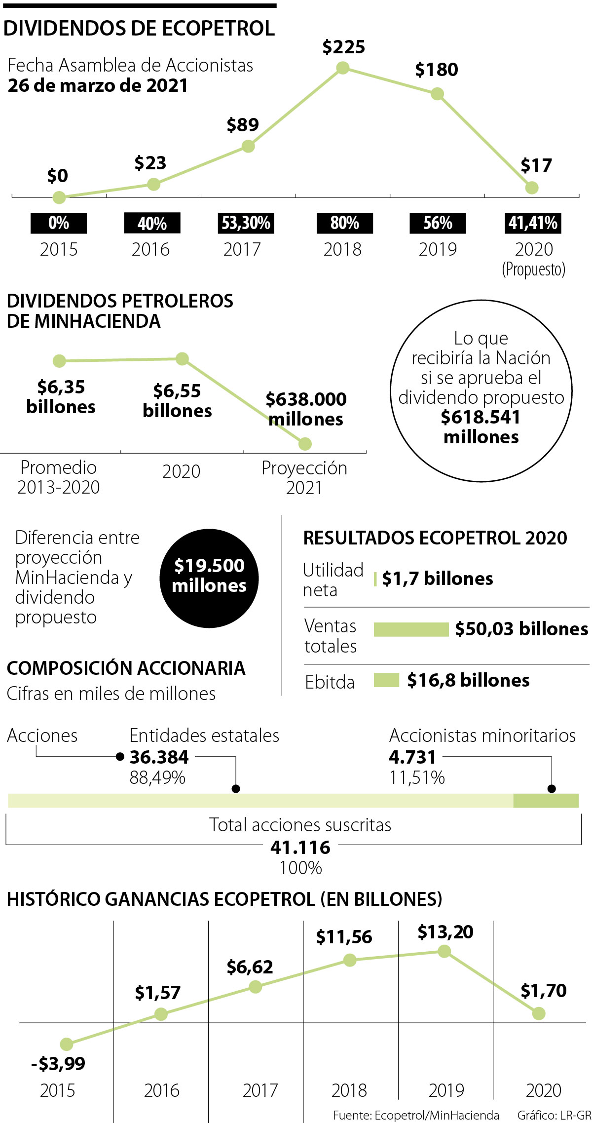 “Repartir cerca de 41% de la utilidad ajustada (parte baja del rango que va de 40% a 60%) es una decisión positiva y una buena señal respecto a la compañía: no repartir mucho en un momento difícil para el sector y reinvertir más. Muestra compromiso de parte del Gobierno que, en últimas, está sacrificando dividendos”, anotó Andrés Duarte, director de renta variable en Corficolombiana.