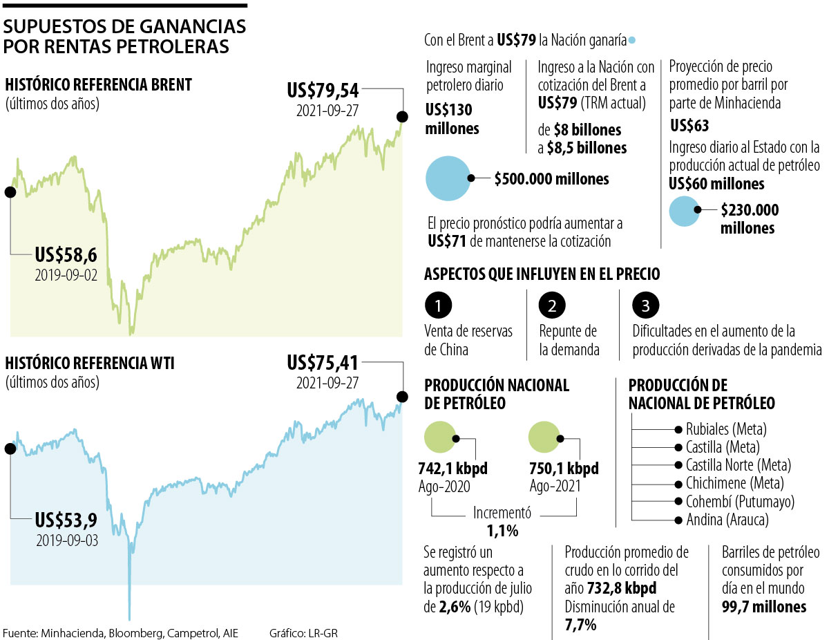 Fuentes del Ministerio de Hacienda ilustraron que, si el precio se mantiene en niveles de US$79 a US$80 el barril en lo que queda de 2021, el promedio del año se podrá ubicar en US$71.