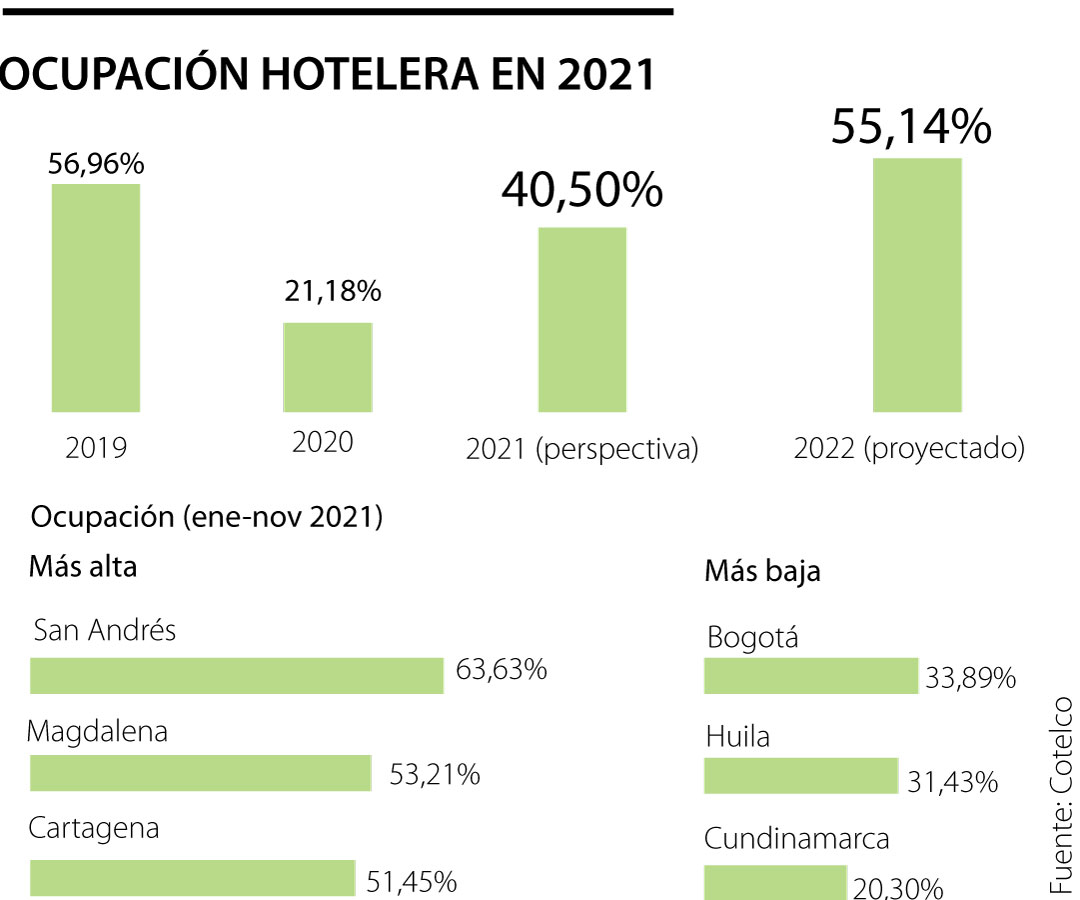 La Asociación Hotelera y Turística de Colombia (Cotelco) hizo un balance del sector hotelero nacional de 2021 y reveló que se espera que el año termine con una ocupación hotelera promedio de 40,50%. A su vez, se pronosticó que la ocupación de 2022 se elevaría a 55,14%, llegando a niveles cercanos de 2019, año en el que la ocupación se ubicó en 56,96%.