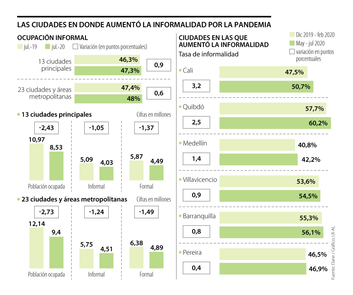 La crisis derivada de la pandemia atacó al empleo formal e informal. A julio, según el Departamento Administrativo Nacional de Estadística (Dane), la población ocupada informal, es decir, los trabajadores por cuenta propia, empleados domésticos o quienes viven del ‘rebusque’, se redujo en 2,3 millones de personas frente a julio de 2019 y llegó a 10,8 millones de colombianos en las 23 ciudades, pero la tasa aumentó en 0,6 puntos porcentuales (pps), y al ver el resultado por ciudades, hay unas en las que se disparó esta condición.