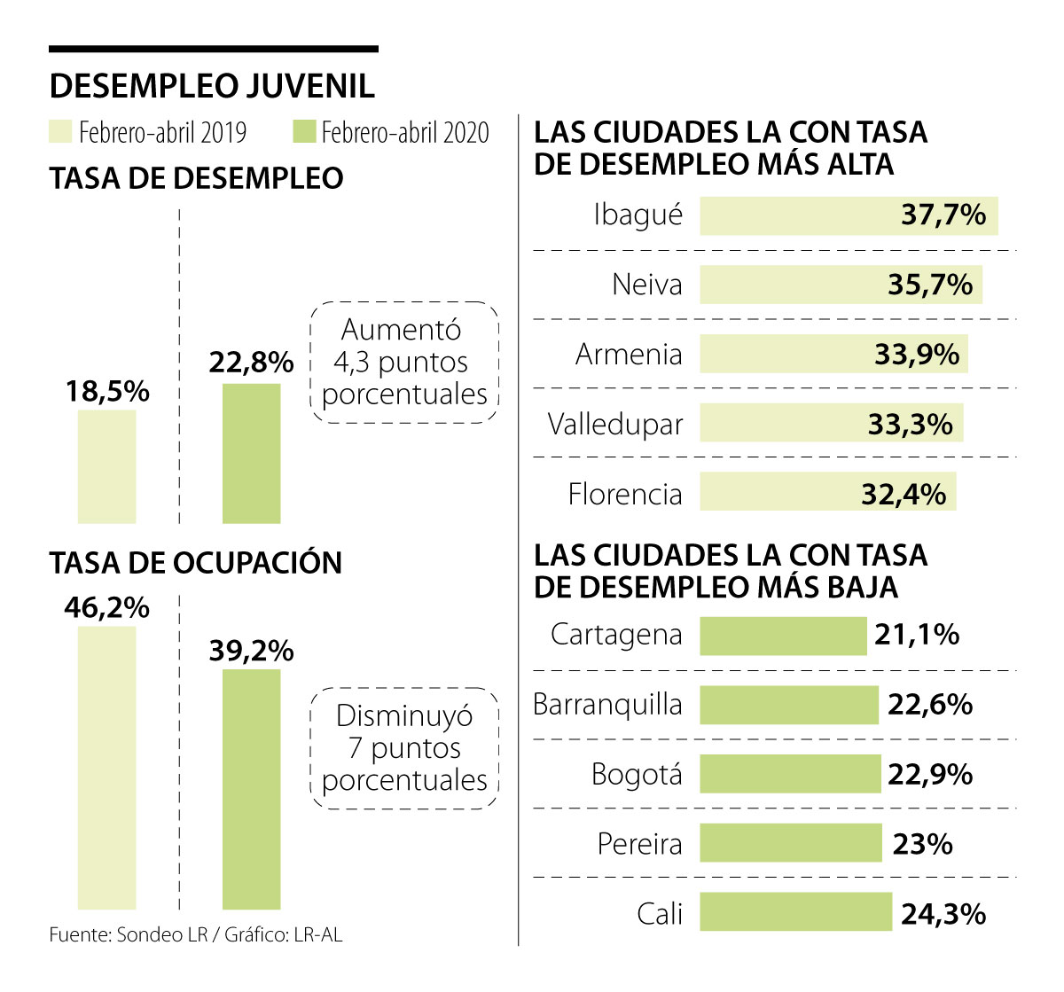 Las tres ciudades que mostraron mayor nivel de desempleo juvenil fueron Ibagué, con una tasa de 37,7%, seguido de Neiva, con un aumento de 35,7% y Armenia con un nivel cercano a 34%. En total, la tasa tuvo un incremento para todas las ciudades de 16 puntos porcentuales. No obstante, ciudades como Cartagena, Barranquilla y Bogotá mostraron datos más bajos.
