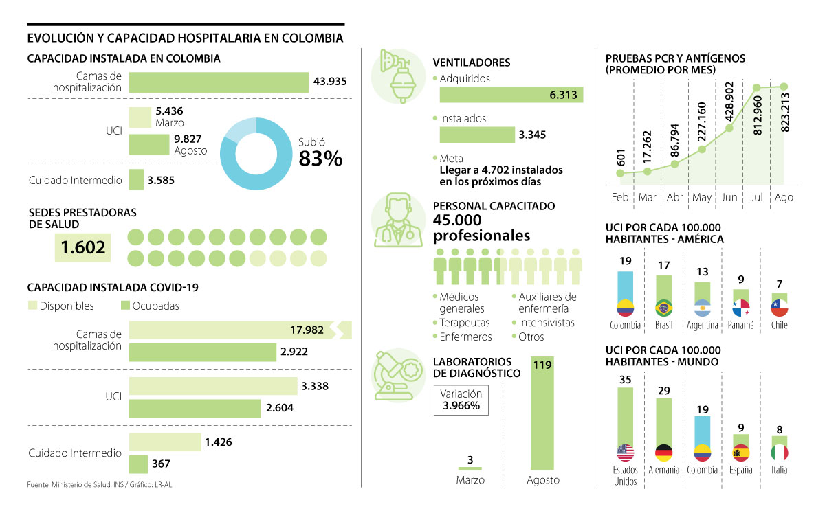 A nivel local, uno de los casos más preocupantes para las autoridades de salud y el gremio de médicos especialistas era la baja capacidad instalada de UCI. Al principio de la emergencia (marzo), el país contaba con 5.346 camas y, actualmente, el número aumentó 83%, a 9.827 unidades.