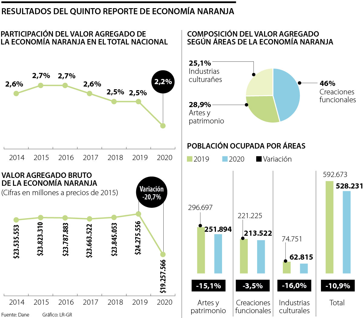 Siendo este uno de los sectores más afectados por las cuarentenas estrictas, en 2020 las actividades de la Economía Naranja perdieron más de 64.000 empleos. La caída más pronunciada se dio en la rama de artes y patrimonio, con una pérdida de 44.803 puestos de trabajo. Seguido estuvieron las industrias culturales, con 11.903 empleos menos; y las creaciones funcionales, con una pérdida de 7.703 puestos.