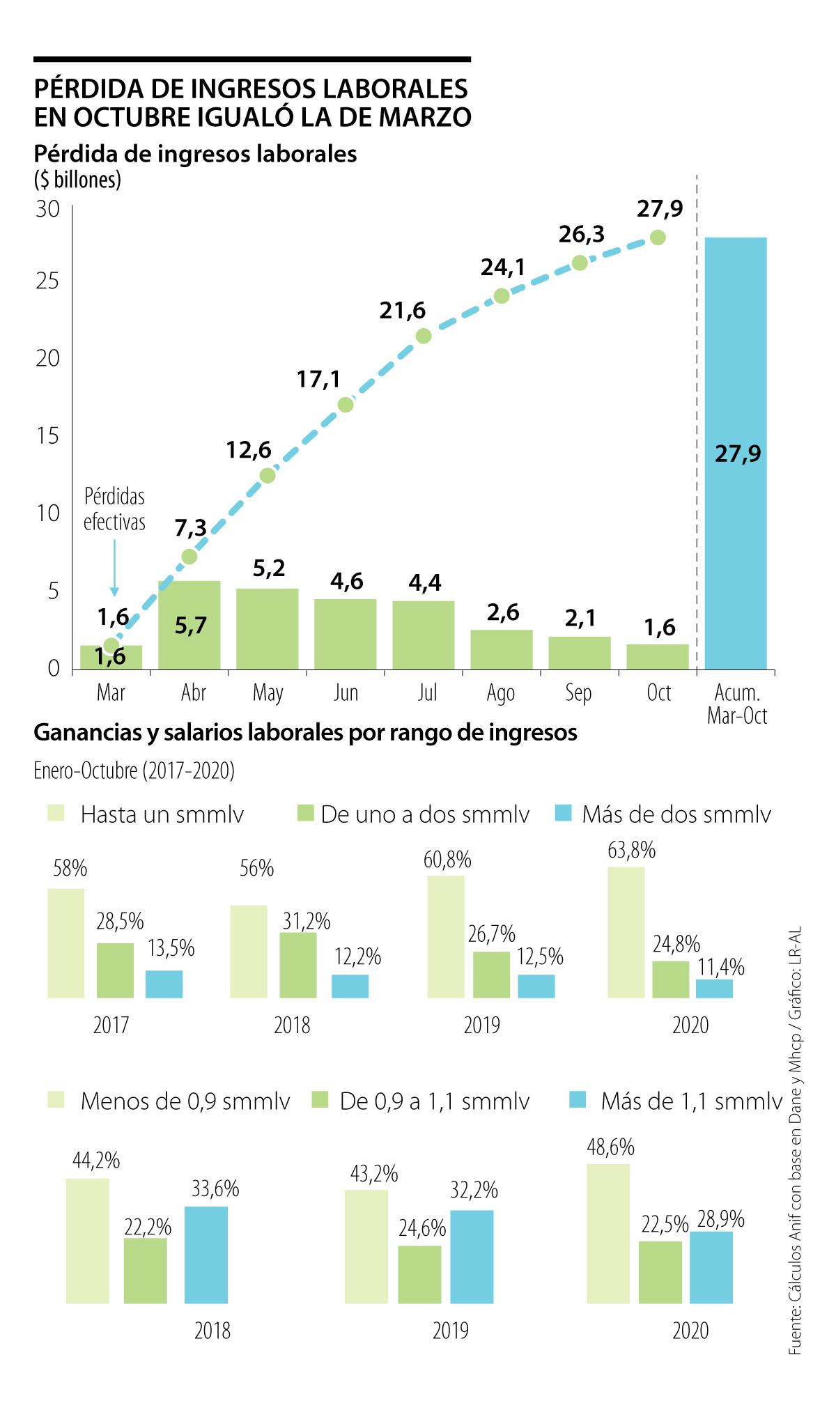 Por ejemplo, las cifras de Anif señalan que, en octubre, cuando la tasa de desempleo fue de 14,8% y el número mensual de colombianos ocupados subió de 20,2 en septiembre a 21,2 millones, los hogares dejaron de recibir $1,6 billones por sus trabajos, un monto idéntico al del tercer mes del año, cuando aún el sistema no veía por completo los impactos del covid-19.