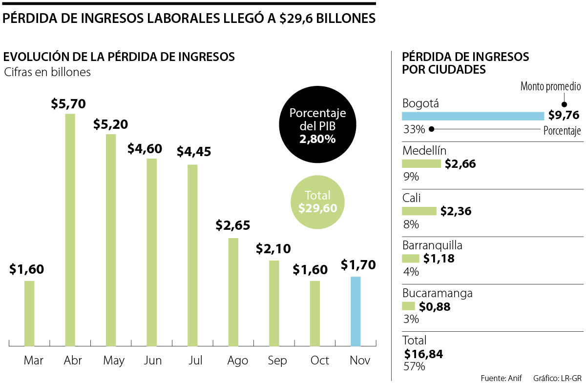 Mes a mes, los ingresos de los colombianos siguen viendo afectaciones por los efectos de la crisis económica que causó la pandemia y, entre marzo y noviembre de 2020, según la Asociación Nacional de Instituciones Financieras (Anif), la pérdida acumulada llegó a $29,6 billones, monto que representa 2,5% del Producto Interno Bruto (PIB) de Colombia.