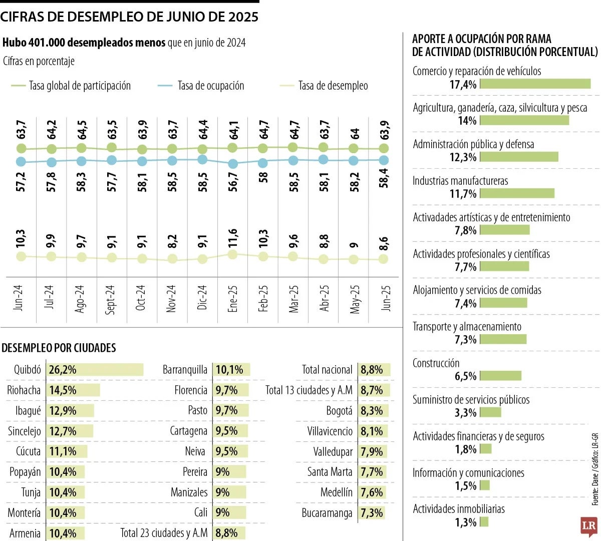 Frente al comportamiento del indicador por ciudades, Quibdó se mantiene como la ciudad con la mayor tasa de desempleo con 26,2%, (aunque cayó desde 27,2% de junio de 2024), seguido por Riohacha que tuvo una tasa de desempleo de 14,5%, Ibagué con 12,9%, Sincelejo con 12,7% y Cúcuta y su área metropolitana con 11,1%.