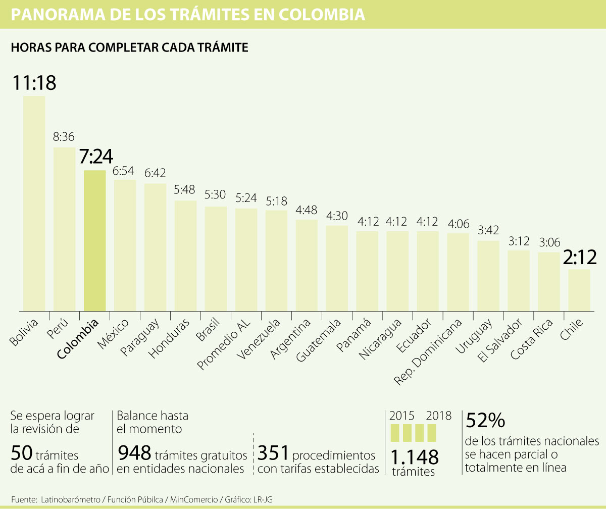 De acuerdo con estudio de Latinobarómetro, Colombia sigue siendo uno de los países donde más tiempo toma la realización de un trámite en la región, solo superado por Bolivia y Perú, lo que muestra el reto de las entidades gubernamentales, y ante esta realidad, se espera que el Gobierno revele, este fin de semana, una nueva estrategia nacional para atender diligencias transversales a varias entidades.