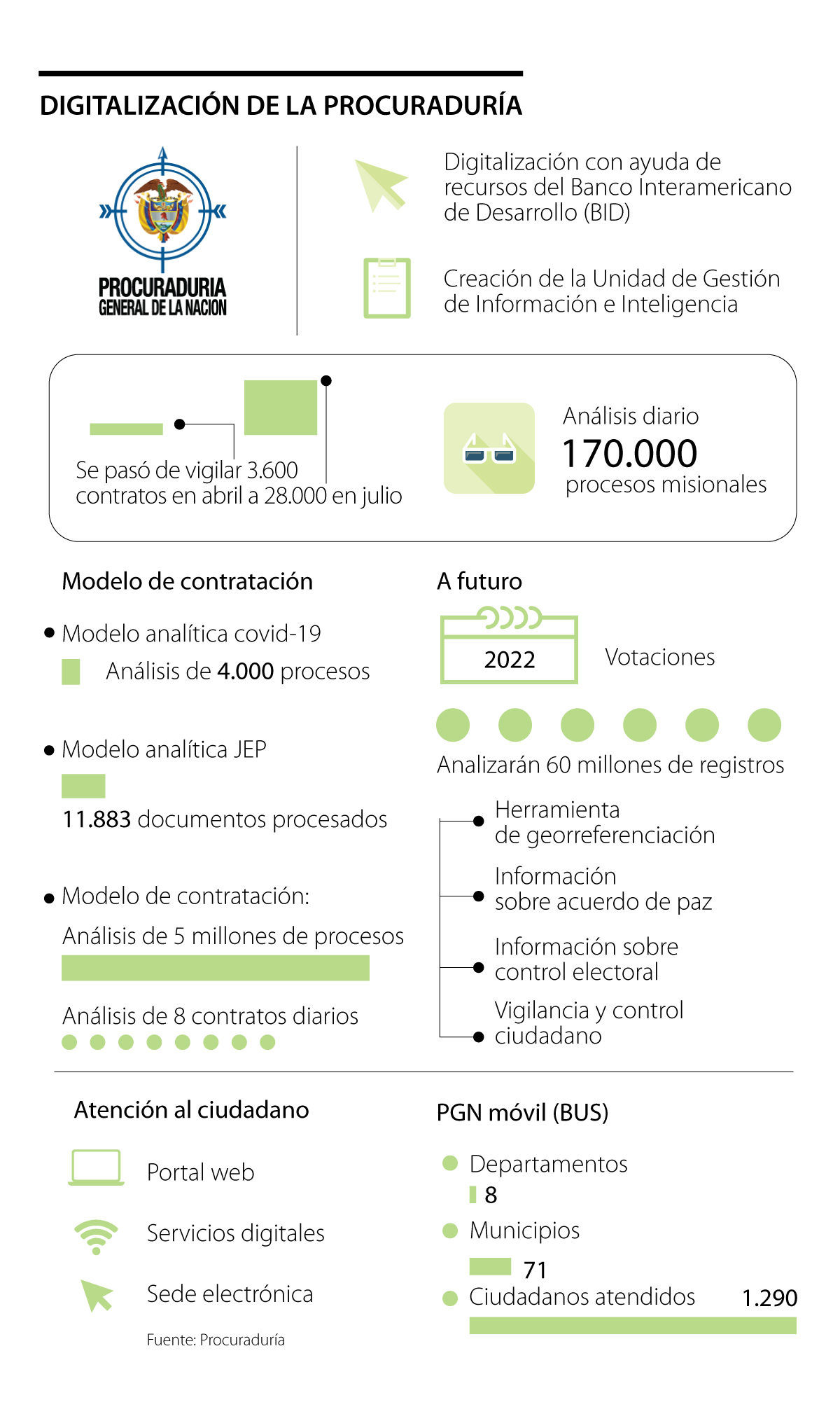 Con la financiación del Banco Interamericano de Desarrollo (BID) por más de US$40 millones, la Procuraduría creó su Unidad de Gestión de Información e Inteligencia con la que se analizan, entre otras cosas, los contratos públicos, información del acuerdo de paz, la Justicia Especial para la Paz (JEP) e información sobre el manejo del covid-19. Además, se deja la información a disposición de la ciudadanía.