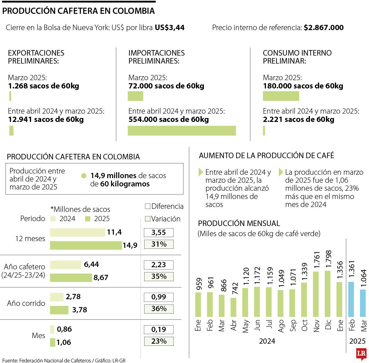 La producción de café en Colombia cerró el primer trimestre de 2025 con un crecimiento de 36% frente al mismo periodo del año anterior, según reportó la Federación Nacional de Cafeteros, FNC. En los tres primeros meses del año se registró una cosecha de 3,78 millones de sacos de 60 kilogramos, un resultado que la federación considera histórico frente a los desafíos del sector.