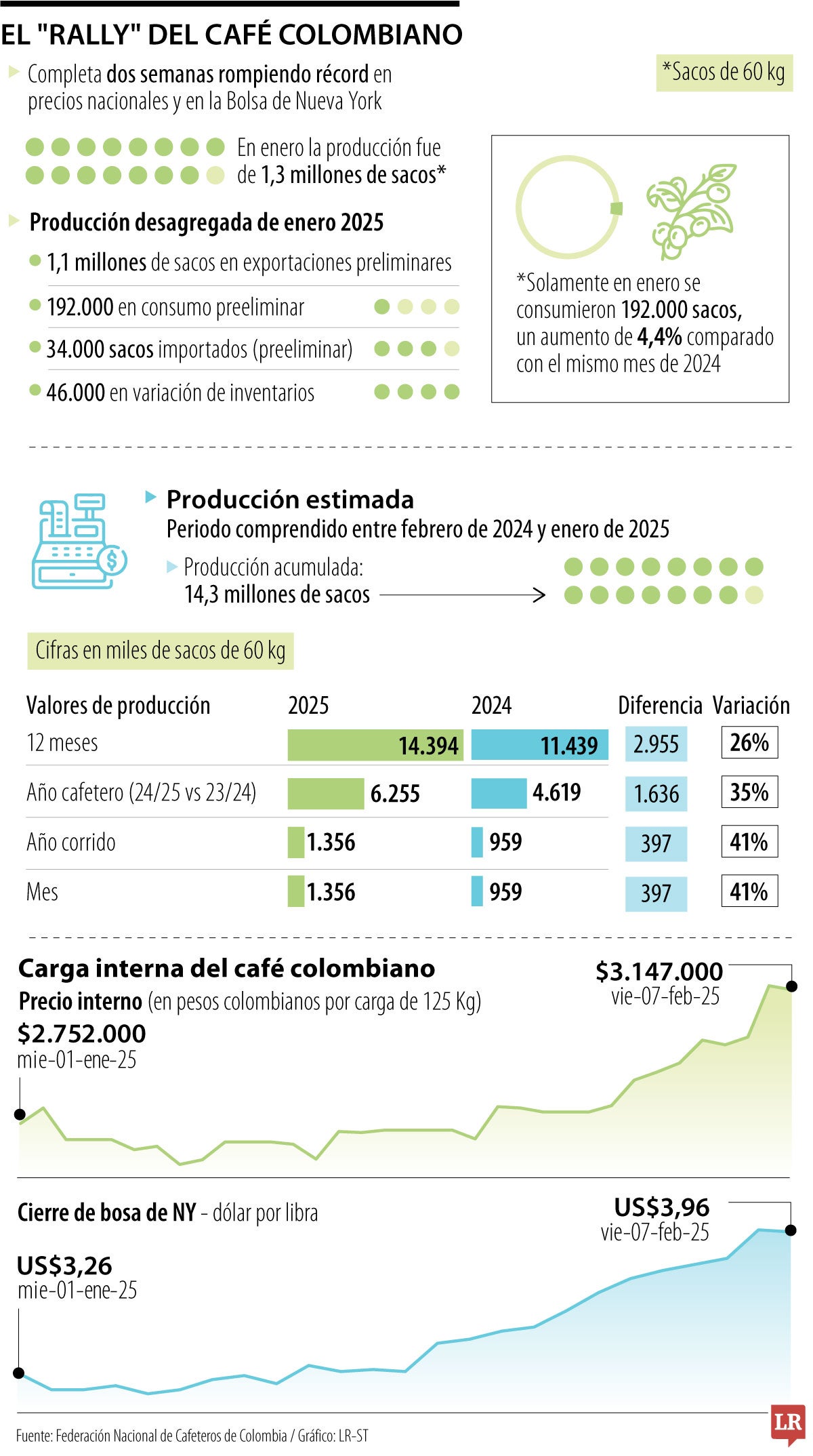 La Federación Nacional de Cafeteros presentó un balance positivo de la producción nacional al cierre de 2024, con 14.394.000 sacos, 26% más que los 11.439.000 registrados en 2023. Esta tendencia al alza se mantiene en 2025, con un crecimiento de 41% en enero frente al mismo mes del año anterior, alcanzando 1,35 millones de sacos. De este total, el consumo interno representó 192.000 sacos, un incremento de 4,4% respecto a enero de 2024.
