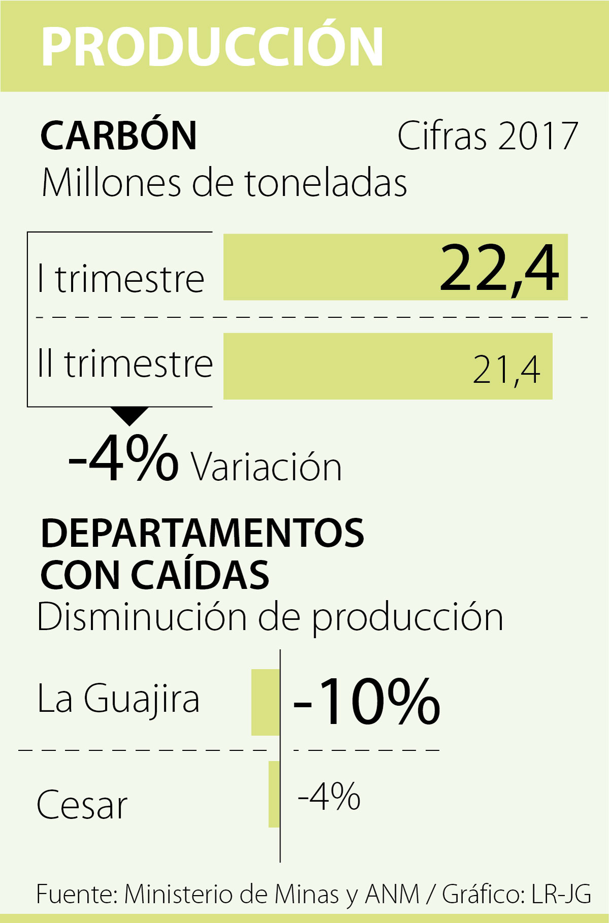 La cartera explicó que la baja en la producción de carbón proviene de los proyectos de Cesar y La Guajira, donde disminuyó 4% y 10% respectivamente, mientras que el carbón del centro del país pasó de 1,2 millones de toneladas en el primer trimestre, a 1,5 en el segundo, repuntando un 27%.