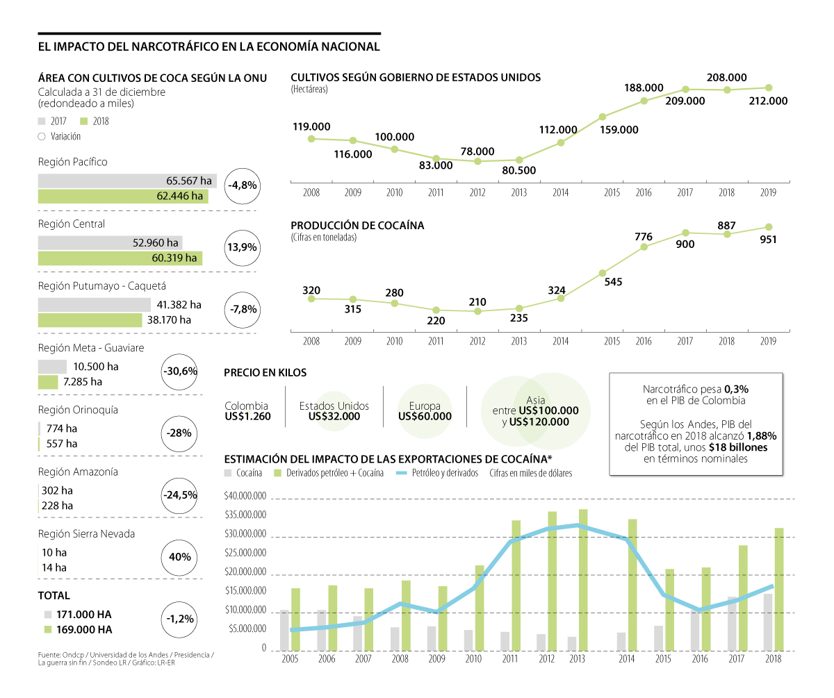 Y es que el impacto económico también lo reseñó el exministro de Agricultura, Andrés Felipe Arias, quien, en su texto, ‘Cocaína, ¿estabilizador macroeconómico colombiano 2015-2018?’, agregó que el peso de esta industria es tan grande que, a raíz del desplome del precio mundial de los hidrocarburos en 2014, la cocaína llegó a ser el principal estabilizador de las cuentas locales.