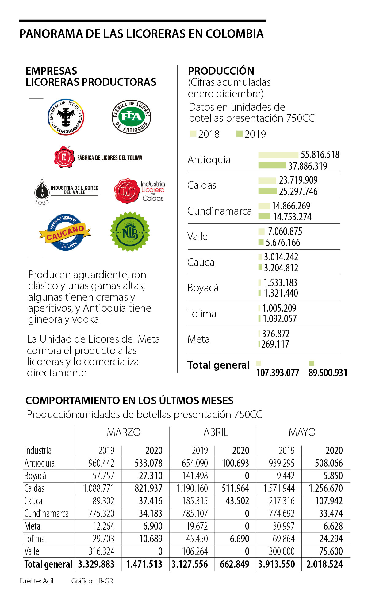 Si bien la crisis generada por el covid-19 ha acentuado la mala hora que atraviesan las licoreras, desde antes ya se había sentido un remezón en este sector. Mientras antes había en el país 19 licoreras, hoy solo quedan siete productoras: la Empresa de Licores de Cundinamarca, la Fábrica de Licores de Antioquia, la Fábrica de Licores del Tolima, la Industria de Licores del Valle, la Industria Licorera de Caldas, la Industria Licorera del Cauca y Nueva Licorera de Boyacá. La Unidad de Licores del Meta compra el producto, lo comercializa y algunas de estas grandes licoreras le maquilan el licor a Nariño, Caquetá, Chocó, Huila y Putumayo.