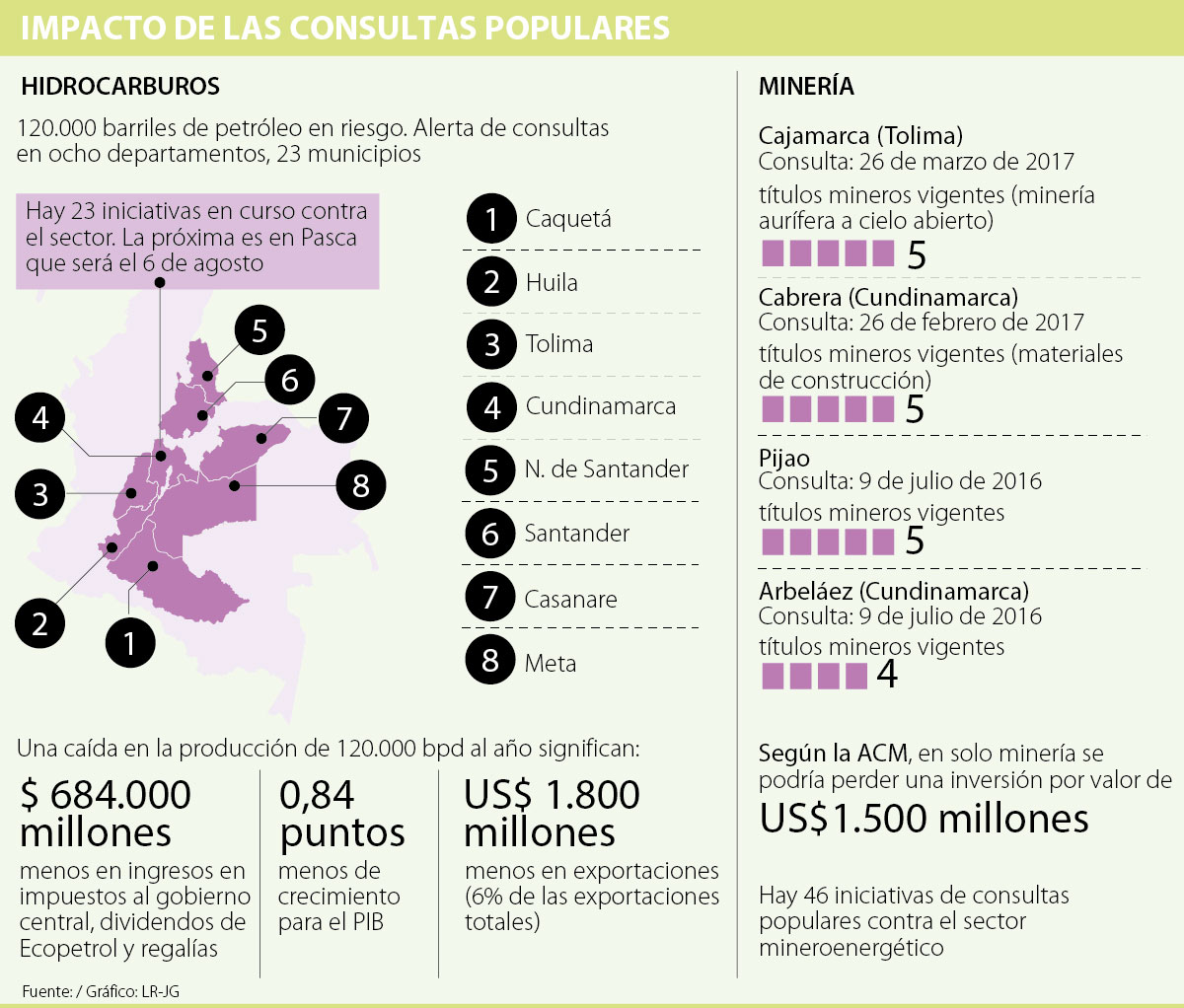 Con los 23 municipios que tienen procesos de consultas populares contra el sector de hidrocarburos, se pone en riesgo la producción de cerca de 120.000 barriles de petróleo diarios y el futuro de al menos 14 proyectos de exploración. El impacto se vería también en los ingresos para la nación y en regalías, al igual que menos crecimiento del PIB.
