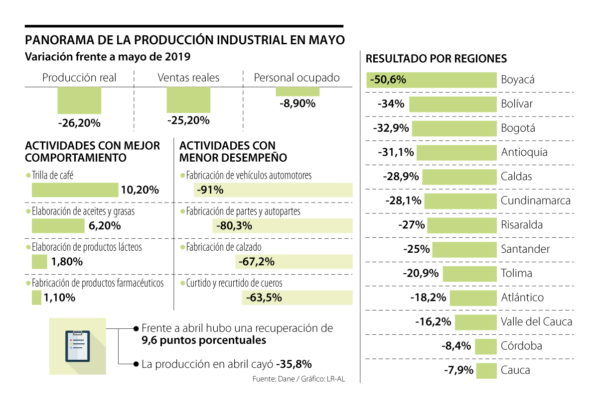 En ese periodo, según el Dane, la producción real de la industria manufacturera tuvo una caída de 26,2%, las ventas reales bajaron 25,2% y el personal ocupado cayó 8,9% (ver gráfico). Y si bien el análisis de la entidad estadística sigue mostrando una caída sustancial en todos los puntos, lo cierto es que, frente al mes anterior, el panorama fue distinto.