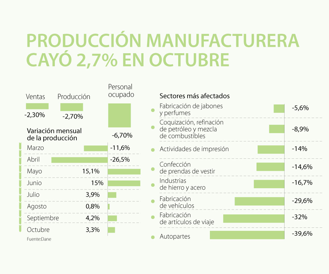 Aunque las cifras anuales aún son negativas, el Departamento Administrativo Nacional de Estadística (Dane) reveló que, en octubre, la producción real manufacturera presentó una caída de -2,7%, la cifra más baja presentada en lo corrido de la pandemia, pues en septiembre la baja fue de -2,9%; en agosto de -10,3%; en julio de -8,5%: en junio de -9,9%, en mayo de -26,8%, y en abril de 35,8%.
