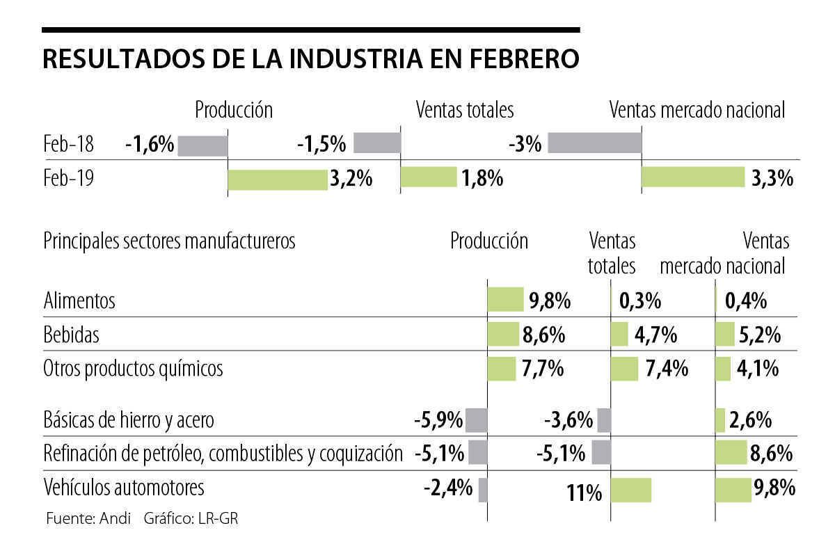 Para su más reciente boletín, correspondiente a febrero, la Andi reportó que la producción de la industria se incrementó 3,2%; las ventas crecieron en 1,8% y, dentro de éstas, las ventas hacia el mercado interno reportaron un alza de 3,3%.