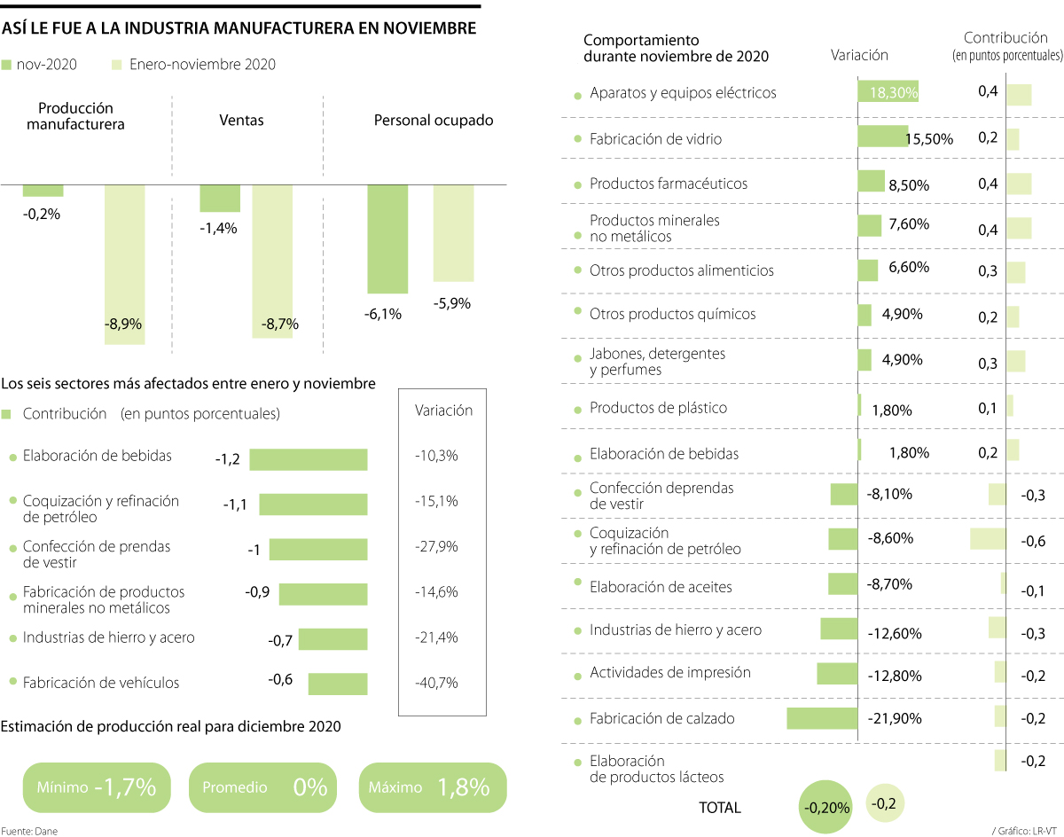 Estas cifras concluyen que, entre enero y noviembre de 2020, la manufactura acumuló una caída anual de 8,9%, cifra que no tendrá mayores modificaciones para todo el año, pues la estimación de variación que la entidad estadística tiene para diciembre es de 0%, es decir, sin mayores variaciones frente al mismo periodo del año anterior.