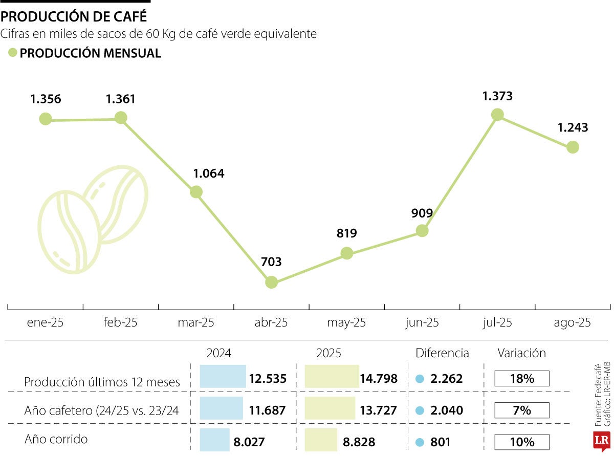 La producción nacional de café en agosto alcanzó 1,24 millones de sacos de 60 kilogramos, con un crecimiento de 19% frente a agosto de 2024. De acuerdo con Bahamón, “este resultado prolonga el impulso observado en julio y refleja el desfase en la cosecha del primer semestre, originado por las lluvias persistentes que desplazaron la recolección hacia el inicio del segundo semestre”.