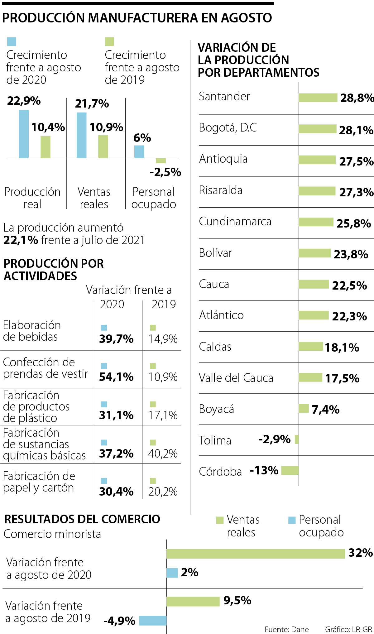 Si se desagregan las cifras por departamentos, en Santander y Bogotá se registraron las mayores alzas anuales, con variaciones de 28,8% y 28,1% respectivamente. Seguido están Antioquia, Risaralda y Cundinamarca; mientras que solo hubo contracciones en la producción en Córdoba y Tolima.