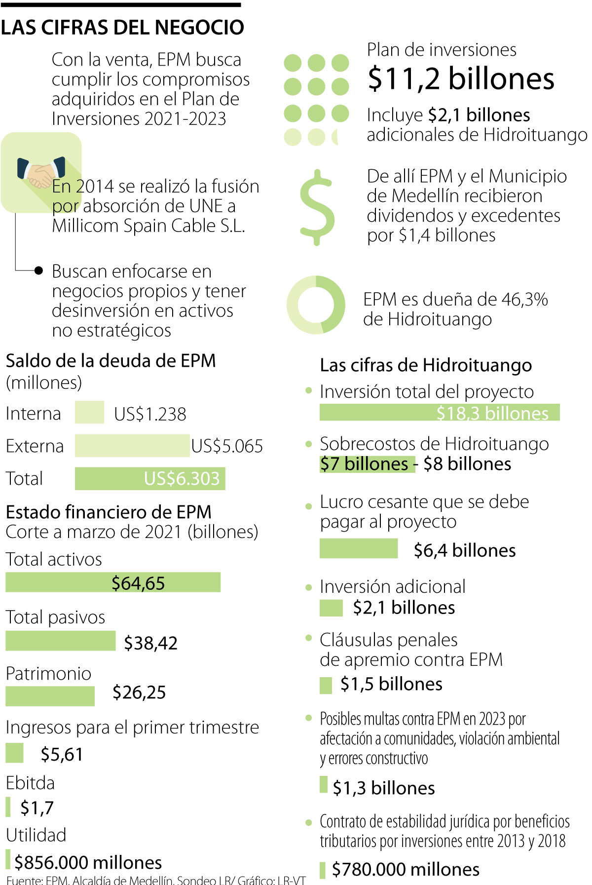De la misma manera, de llegar a producirse el eventual negocio, gran parte de las transferencias tendrían como destino la finalización del proyecto de Hidroituango, que acorde a la actualización de datos, tiene inversiones adicionales de $2,1 billones y un costo total cercano a $18,3 billones.