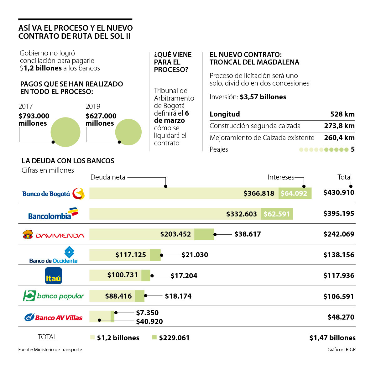 De acuerdo con las cifras del Ministerio de Transporte, las acreencias con las entidades financieras suman $1,47 billones, entre intereses y capital. De ese monto, el mayor pago iría para Banco de Bogotá y Bancolombia, con $430.910 millones y $395.195 millones, respectivamente. A Davivienda le cancelarían $242.069 millones; a Banco de Occidente, $138.156 millones; a Itaú, $117.936 millones; a Banco Popular, $ 106.591 millones y a Banco Av Villas, $48.270 millones. Ayer, el Consejo Gremial negó haber emitido un comunicado que empezó a circular en el que se aseguraba que había que proteger la estabilidad jurídica de las empresas que participan en los proyectos de infraestructura.