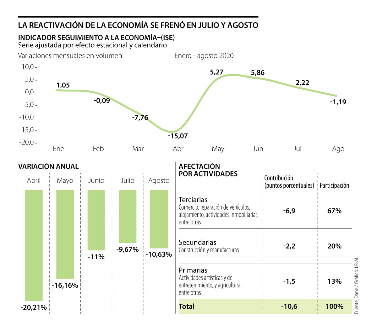 “La tracción de la economía, que venía en 2,22%, ahora pasa a ser de -1,19% y eso significa que el valor agregado que generó la economía en agosto es 1,19% inferior al que se creó en julio por las afectaciones que se presentaron por las medidas complementarias de carácter sanitario en actividades manufactureras y de comercio, en donde tenemos efecto directo de la actividad económica”, dijo.