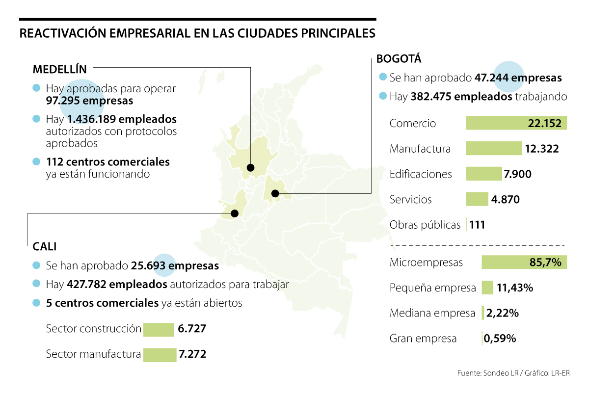 Medellín es la que más compañías ha autorizado y sumando a Bogotá y Cali se han reactivado más de 2 millones de empleos