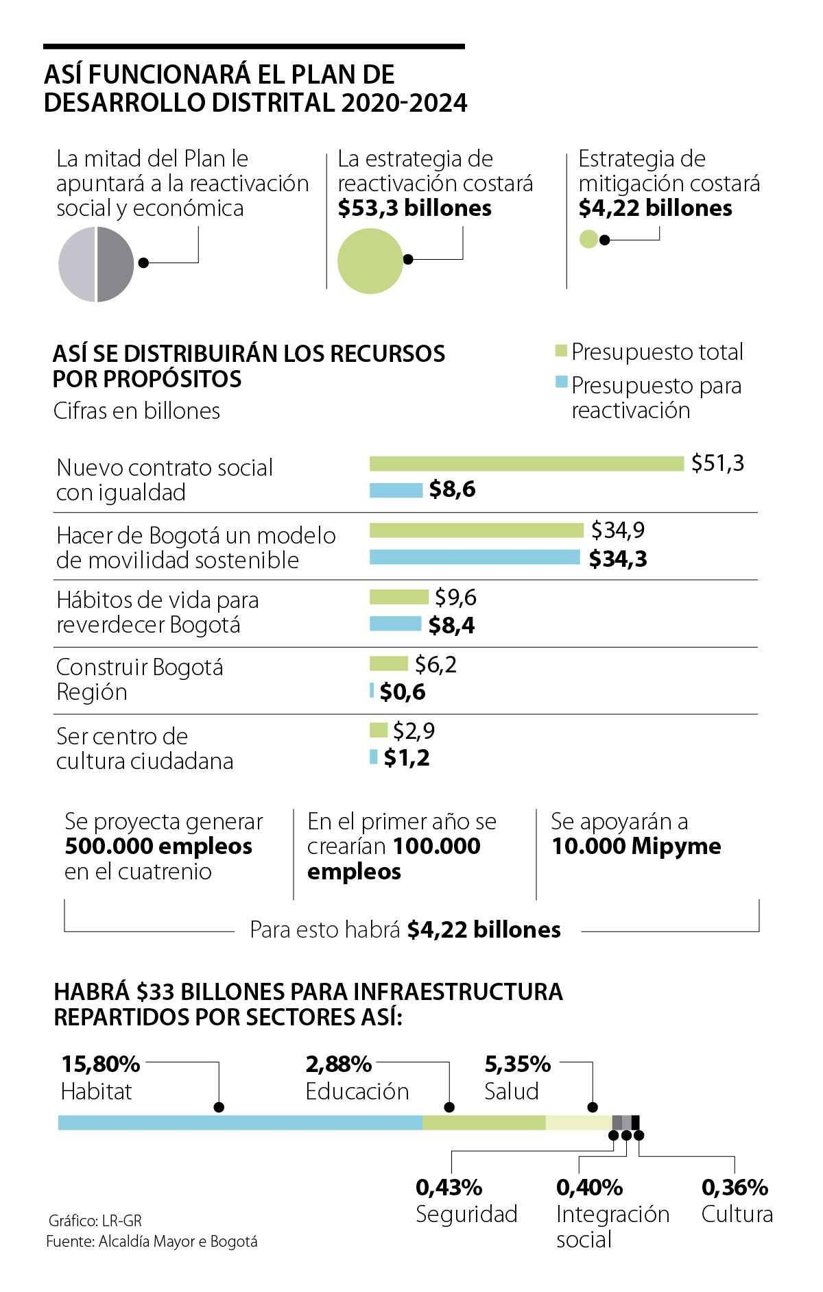 Otro importante propósito para la administración es el de un nuevo contrato social con igualdad, en el cual López siempre ha hecho énfasis para recordar la lucha contra la pobreza. Para este, la Alcaldía determinó que se destinarán $8,6 billones para la reactivación; para los temas ambientales se dispondrán se utilizarán $8,4 billones que estarán enfocados en la recuperación de la economía de la capital.
