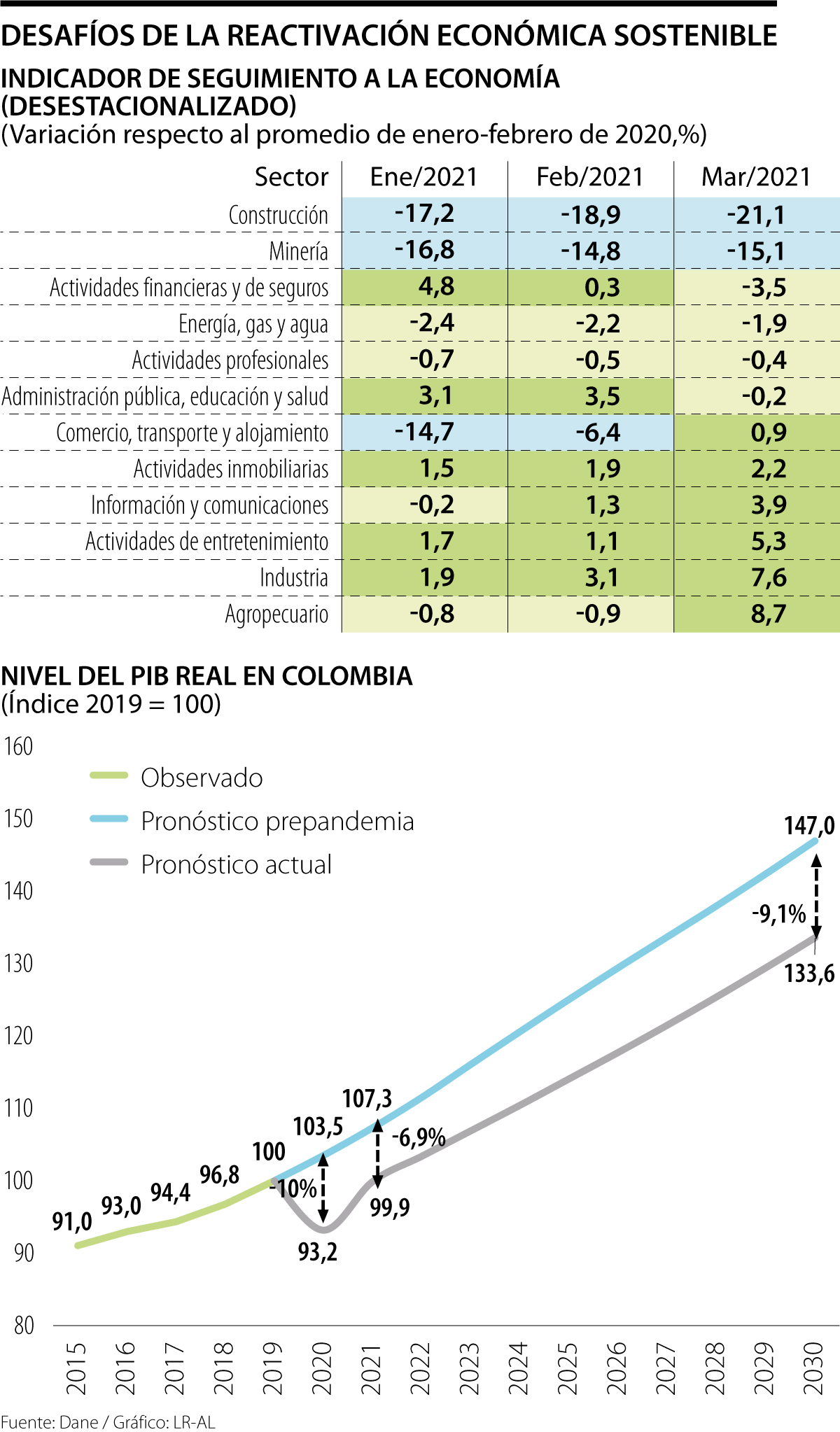 La Fundación para la Educación Superior y el Desarrollo (Fedesarrollo) aseguró que si la economía crece 7,2% como lo prevé este centro de investigación para 2021, el dato representaría una recuperación del nivel de la economía registrado en 2019. Sin embargo, la brecha de crecimiento de la economía, entre un año y otro, seguiría aumentando. “Estamos viendo que si no se hace nada más de aquí a 2030 la economía al final de la década será 9% menos de lo que habría sido en ausencia de la pandemia”, dijo Luis Fernando Mejía, director ejecutivo de Fedesarrollo.
