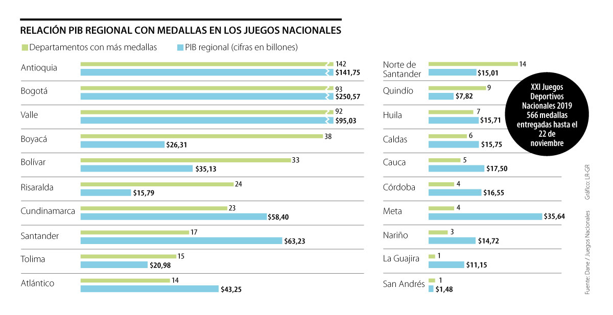 Llama la atención que, precisamente, las tres regiones que han conseguido más medallas en la competencia, comparten un factor común; son las tres economías departamentales más grandes del país. El PIB de Antioquia en 2018 fue de $141,75 billones, el de la capital del país, $250,57 billones; y el del Valle, $95,03 billones.