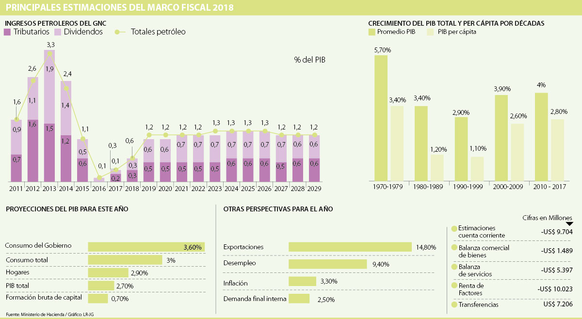 El más importante, en palabras del ministro Cárdenas, fue la recuperación de la renta petrolera para 2018 y 2019. De acuerdo con las cuentas del documento, este año finalizará con ingresos de la actividad petrolera, entre dividendos y tributarios, cercanos a 0,6% del Producto Interno Bruto (PIB), el doble que en 2017, cuando apenas fue 0,3%.