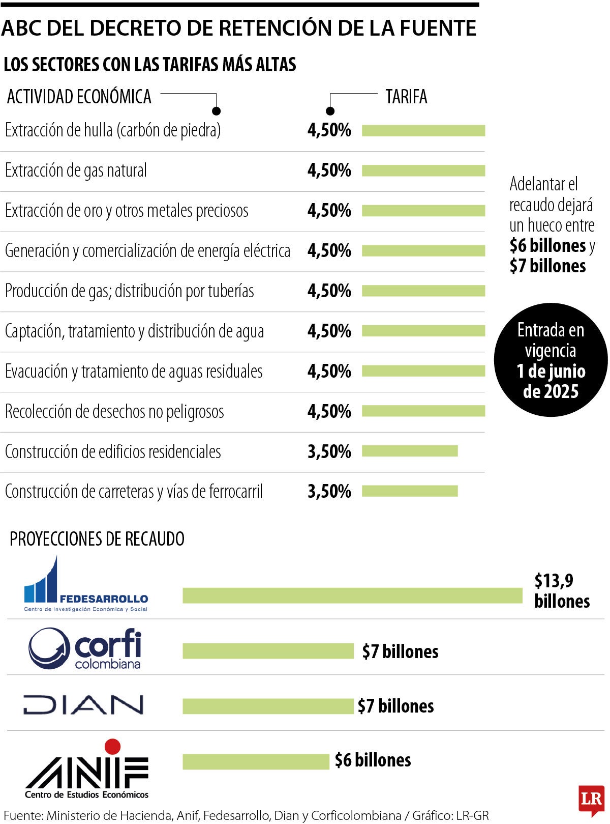 El decreto de retención en la fuente entraría a operar desde el 1º de junio de 2025, según lo manifestó la presidente de la Cámara de Comercio Colombo Americana, Amcham, María Claudia Lacouture. A esto se añade que, de acuerdo a cálculos de Fedesarrollo, las nuevas tarifas del impuesto que implican un anticipo en el pago de tributos de 2026 a 2025, representarían aproximadamente $13,9 billones, es decir, 0,8% del PIB. Así lo manifestó el director de este centro de estudios económicos, Luis Fernando Mejía.