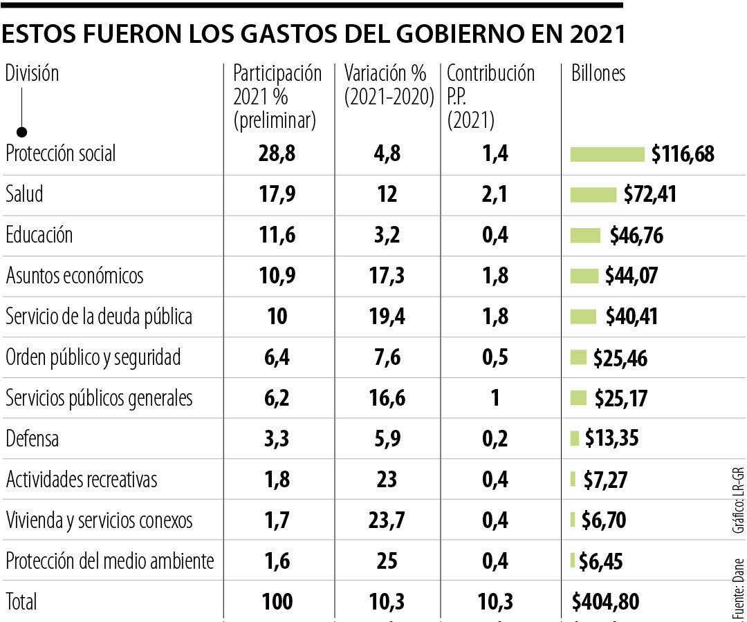 Entre los aumentos que más llamaron la atención para este periodo, según destacó Juan Daniel Oviedo, director de la entidad, estuvieron el gasto en protección social, servicios públicos generales y salud. La participación de este grupo de subsectores (junto con el servicio de la deuda pública) pasó de representar 53,5% del gasto neto en 2020 a 55,8% en 2021.