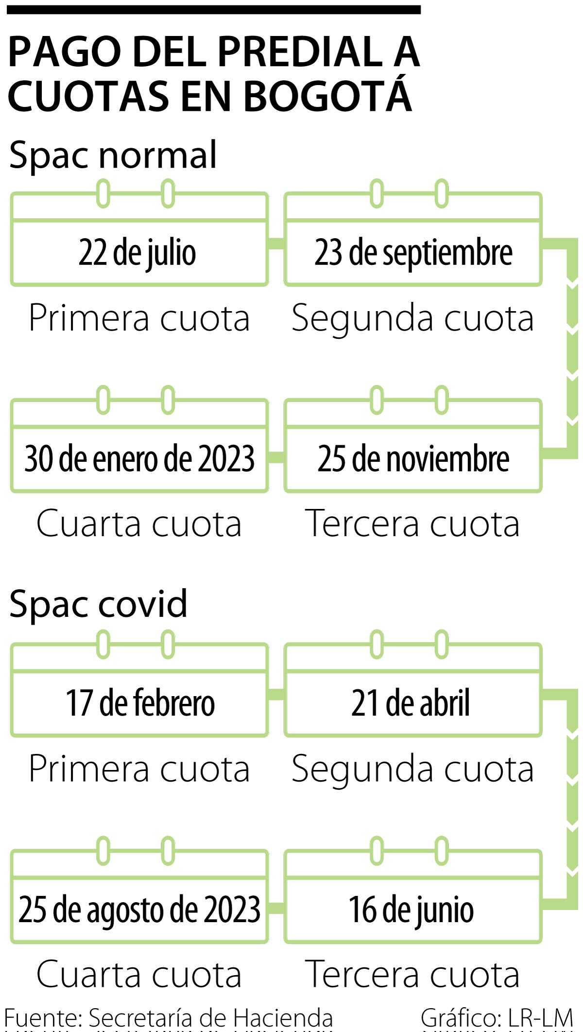 La idea del Distrito con esta alternativa de pago es diferir en cuatro cuotas iguales y sin intereses el pago del impuesto para que los contribuyentes puedan “aliviar su flujo de recursos”. La Secretaría aseguró que cuando se haga la declaración inicial en la página web, el contribuyente deberá escoger entre el Spac normal y el Spac covid. “Con lo cual garantiza el acceso al beneficio, sobre el total del impuesto, y comienza a pagar a partir del viernes 22 de julio en la primera modalidad, y del viernes 17 de febrero, en la segunda. Los siguientes son los vencimientos programados para la vigencia 2022”, dijo el Distrito. Spac normal frece un pago para la primera cuota el 22 de julio, mientras que la segunda debe ser asumida a más tardar el 23 de septiembre.