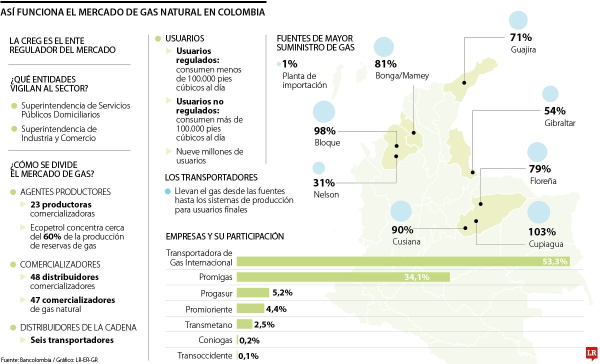 “El mercado de gas en Colombia funciona similar al de energía. Tenemos varios eslabones donde, por un lado, están los agentes productores, comercializadores, y distribuidores de la cadena; y por el otro, los usuarios”, explicó Benhur Palacio, analista de inteligencia de negocios de Bancolombia.