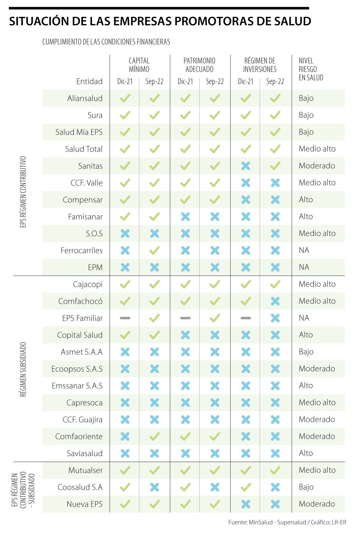 De la 11 EPS del régimen contributivo solo cuatro están al día con todas las condiciones financieras que exige la Ley, que incluyen: capital mínimo, patrimonio adecuado y régimen de inversiones, esto según el registro de Supersalud para “calificar” a las empresas.