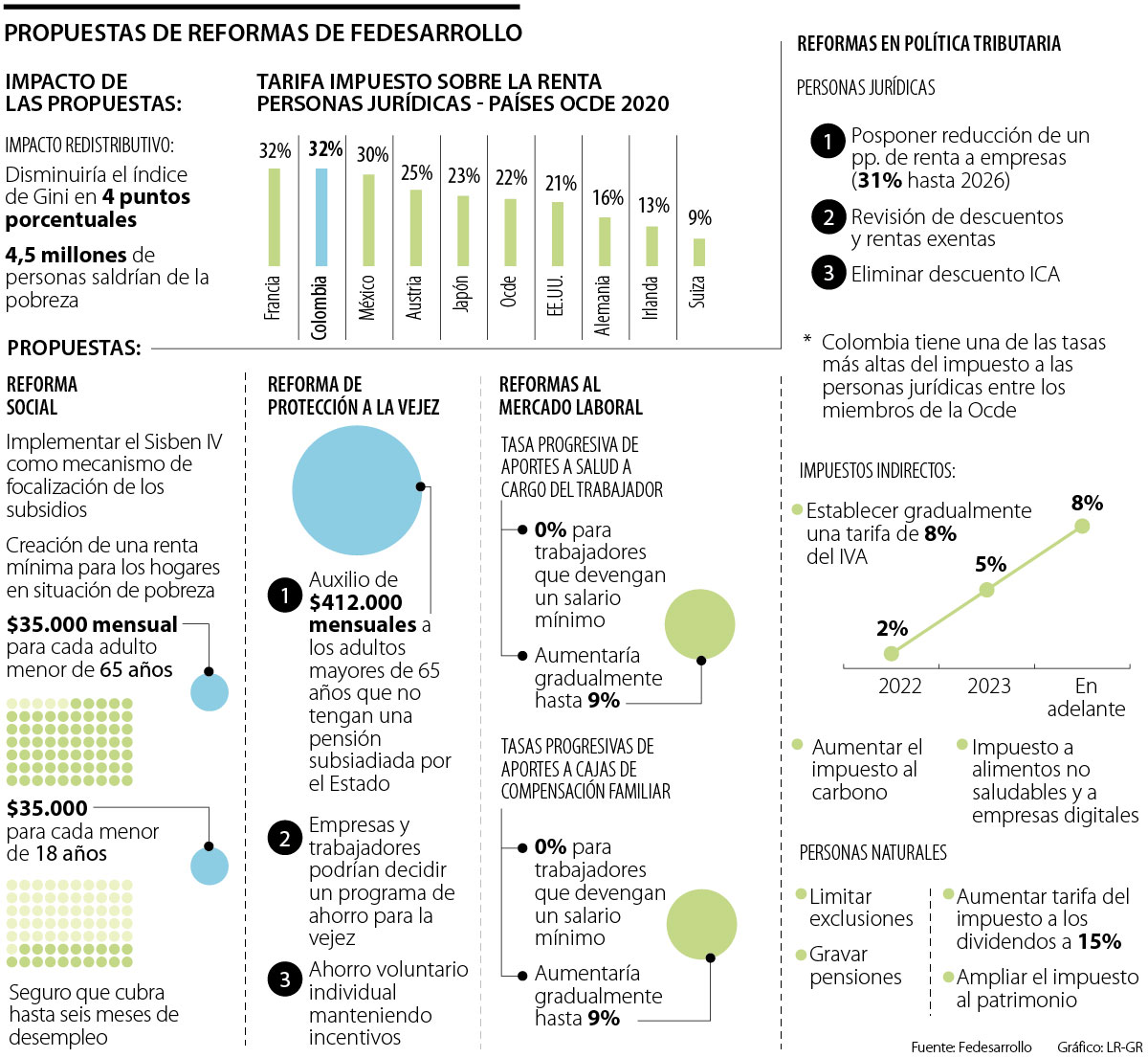 Dentro del documento ‘Reformas para una Colombia post covid-19’, Fedesarrollo hizo una serie de propuestas en materia social, laboral, pensional y tributaria. Algunos de los puntos incluían la implementación de una renta mínima de $35.000 para las personas en condición de pobreza; un auxilio de $412.000 mensuales para adultos mayores que no cuentan con una pensión; implementar tasas progresivas de aportes a salud y a cajas de compensación; y gravar las pensiones más altas.